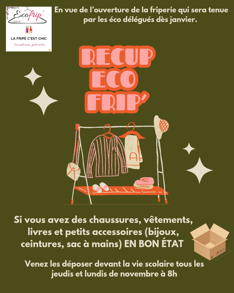 Cette année, les écodélégués vont enquêter sur les problèmes environnementaux liés à l'industrie textile, lutter contre la fast fashion, et vous proposer de donner une seconde vie à tous ces objets de notre vie quotidienne (vêtements, chaussures, livres, accessoires, jeux....) en ouvrant au lycée une Eco'Frip!