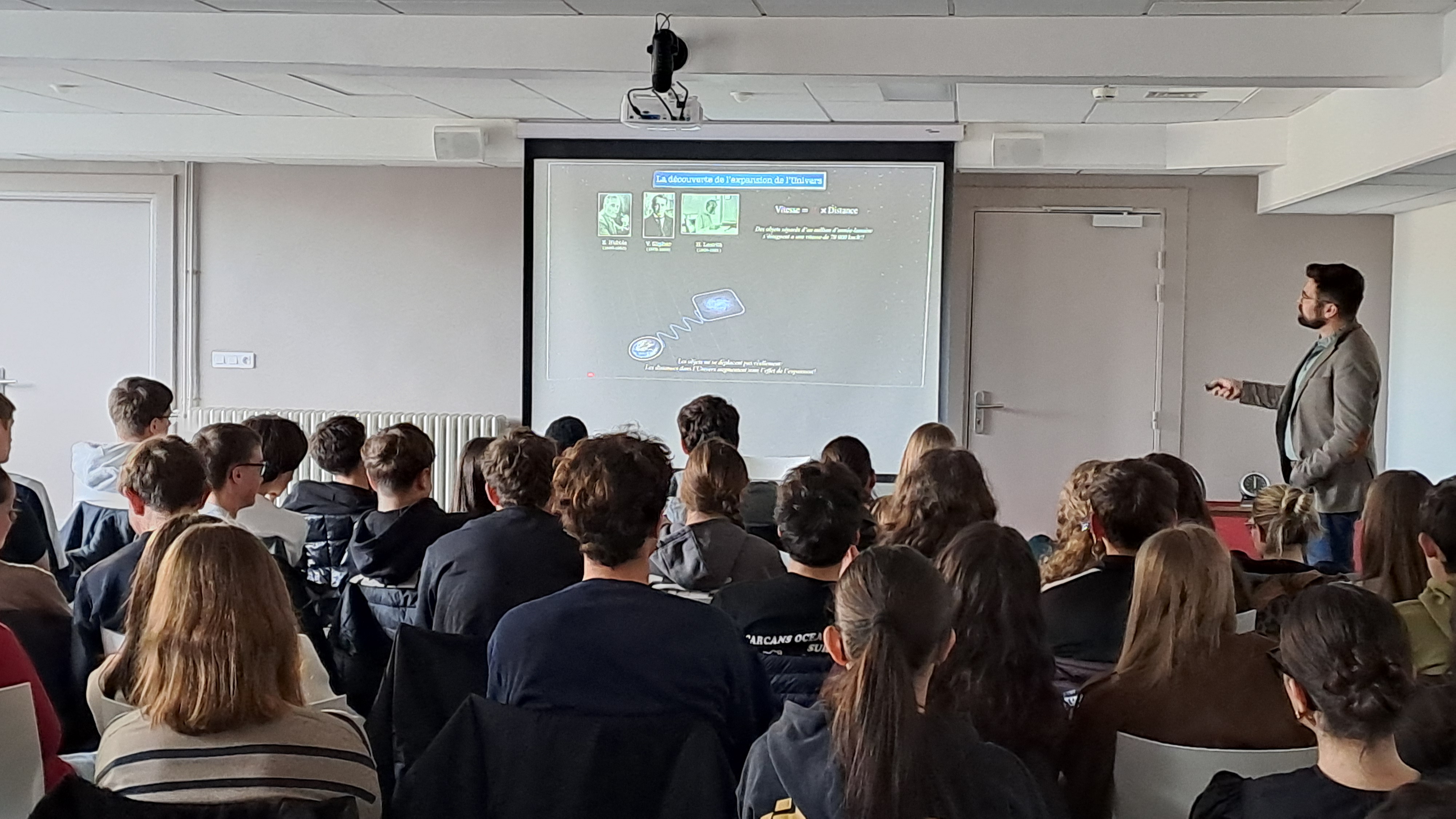 Cette rencontre s’inscrivait dans le cadre du dispositif « La physique étonnante pour un Grand oral percutant ». Plusieurs binômes d’élèves ont d’abord présenté oralement l’un des articles écrit par M. Poulin et publié dans le livre Étonnants Infinis. Ces interventions ont servi de point de départ pour que le chercheur présente ensuite les concepts de matière noire et d’énergie noire.