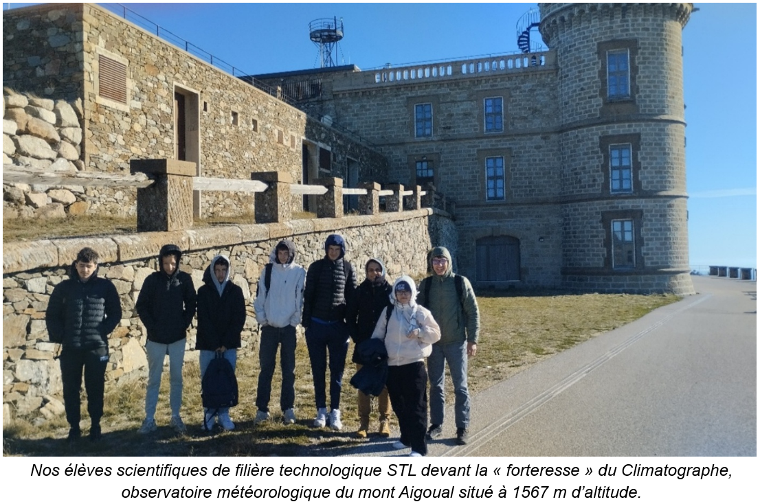 Mardi 4 novembre, les élèves de filière technologique STL se sont rendus au Climatographe, observatoire météorologique de montagne situé au sommet du mont Aigoual, à 1567 mètres d’altitude. Ce déplacement entre dans le cadre des enseignements ‘Ouverture sur le monde de la recherche ou de l’industrie (projet)’, ‘Instrumentation’ et ‘Enseignement technologique en langue vivante (ETLV)’.